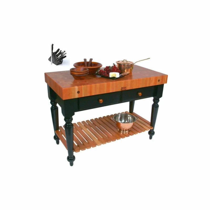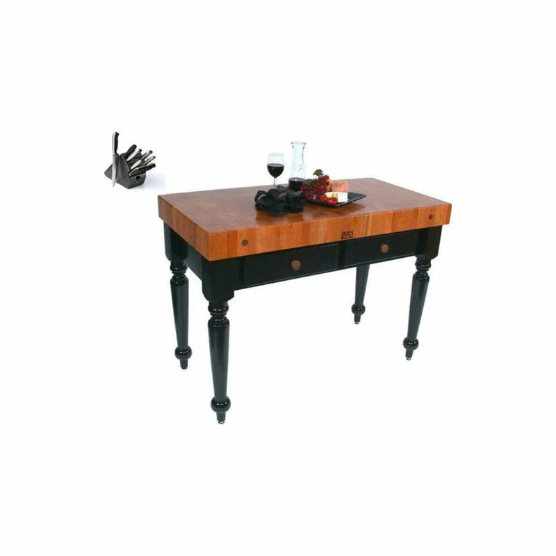 Your guests are sure to appreciate the natural beauty of this ‘Le Rustica’ block table from John Boos & Company. This knife set is the perfect size for display, or to prepare cheese or meats in the front of the house.This also comes with a 13-piece J. A. Henckels Knife set.Set includes: One (1) table with butcher block, One (1) knife set