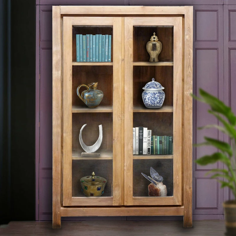 Another unique piece from our popular recycled teak collection is this rustic yet elegant Recycled Teak Solo Cupboard. Store and display your precious belongings without sacrificing too much floor space. This cupboard includes two glass doors that open allowing access to four spacious shelves. Hidden hinges and handle-less design helps to give this piece a minimalistic appeal that makes the premium wood grain the center of attention, giving this piece a character all its own. The compact construction of this cupboard makes it perfect for small kitchens, dining rooms or anywhere space is limited. Makes for a great bookshelf, china cabinet, display case and more.