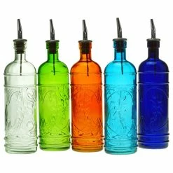 This decorative glass bottle with pour spout and pretty olive branch motif adds an elegant touch to the kitchen island or restaurant table. Its 16.1 oz capacity makes it ideal for storing and dispensing oil, vinegar and more. The bottle’s non-threaded neck is snugly fitted with a stainless steel pour spout for smooth dispensing. Made of recycled glass. Hand-wash only.