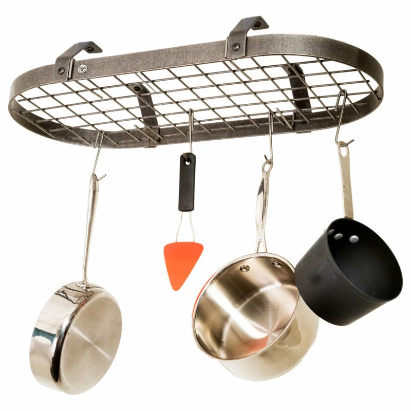 A Low Ceiling mount for kitchens with low ceilings or tall cooks, is Fresh, stylish and decorative. The same classic design as our bestselling 3′ oval – just a bit smaller and lighter. The Decor Collection is still constructed of superior hot rolled, high carbon, steel. Presented in Enclume’s Signature “Hammered Steel” finish with a protective acrylic coating to deliver our expected beauty, durability, and strength for lasting value and enjoyment. This rack comes with a Grid with 4 grid brackets, 2 – S hooks, 2 – Ceiling hooks, 2 – six inch pieces of decor chain, 12 EPHS Pot Hooks. Fast, simple installation, with Enclume’s exclusive “Toggler” anchors. Install toggler instantly in standard drywall. Holds hundreds of pounds. No need to locate joists or studs making installation a snap. Mounts on 16″ Centers if you wish to install on Joists, wood screws are included. All hardware necessary for assembly and installation is included. Hand wrought by skilled craftsmen and proudly made in the USA. 5 Year Limited Warranty. U.S. Dimensions: 29″L x 14″W x 4″H. Patent D504,586S.