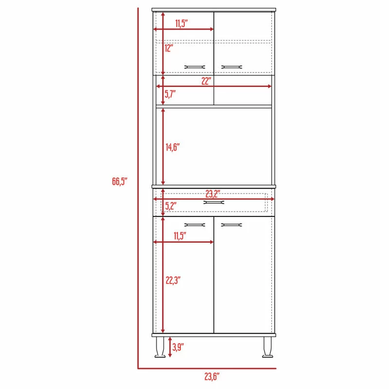 A Perfectly sized multifunctional pantry, with plenty of compartments to store your every utensil and spices you may have and need. A great size pantry, This product has a ton of features for your convenience, such as: Four adjustable metal legs for an excellent balance and stability. At the bottom, you will find a two-door cabinet with plenty of interior room, perfect for storing large items such as pots, pans, or bottles. The 22.3β H x 23.6W x 13.9D will provide ample cabinet space. A drawer 5.2β H x 23.6β W drawer allows for storage of utensils and silverware. A 23.6β W x 13.9β D countertop is the perfect space to put most appliances such as microwaves, air fryers, or food processors.