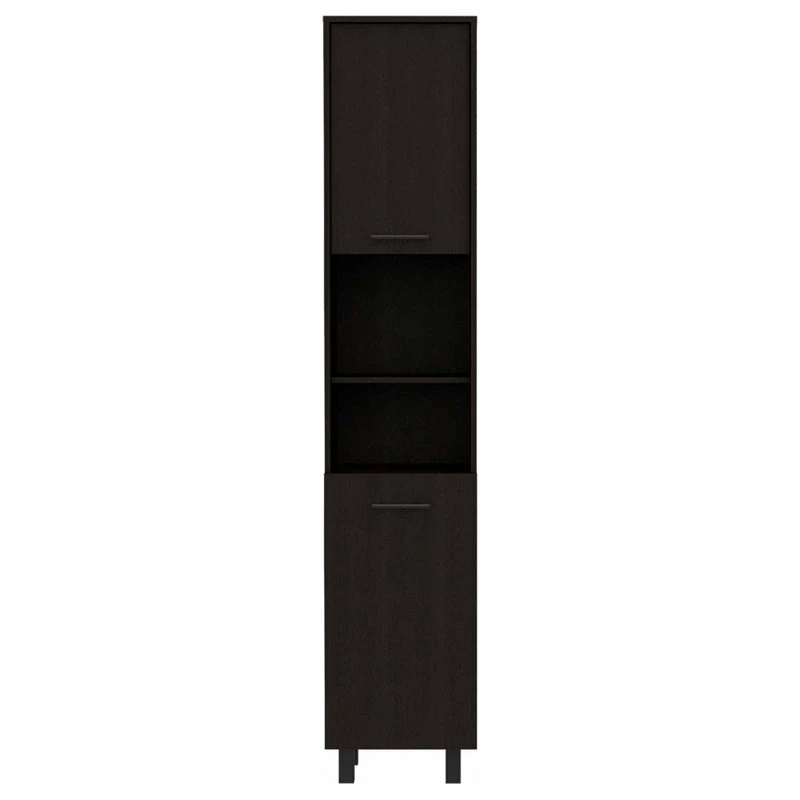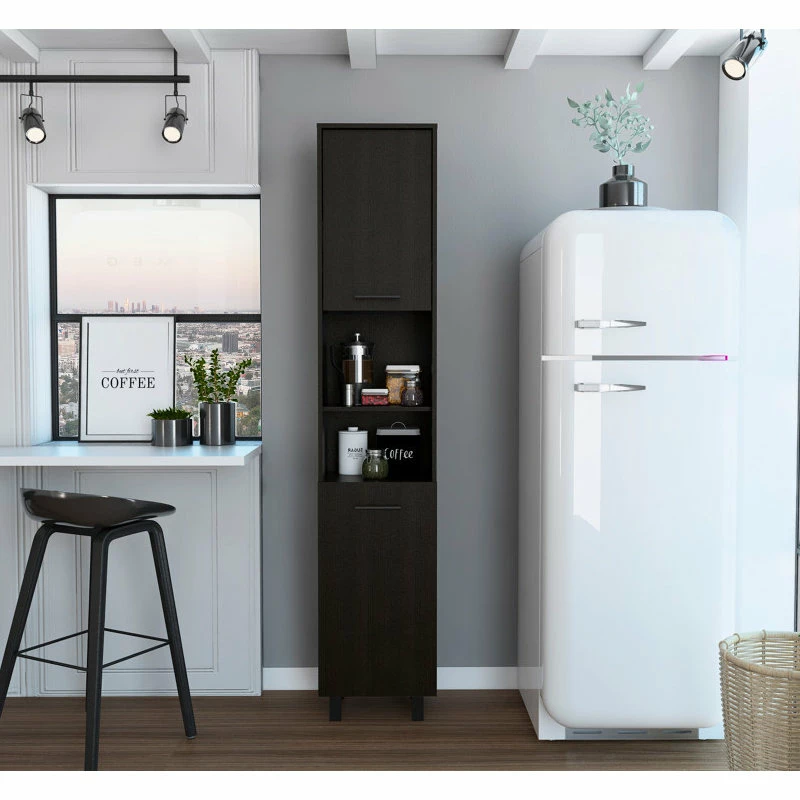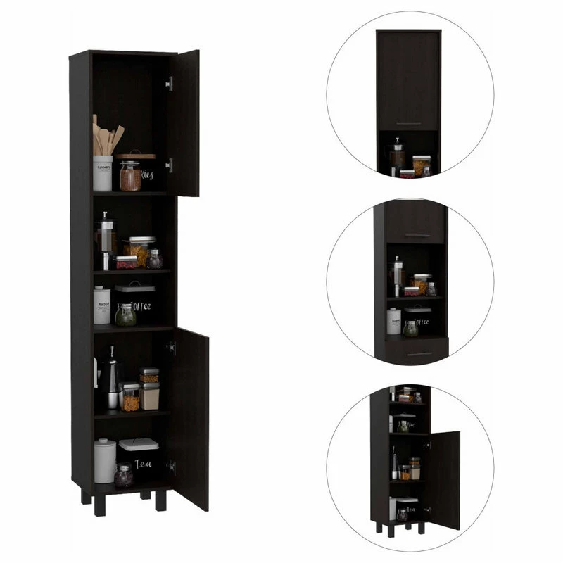 This spectacular pantry, perfect for small spaces, with an ergonomic, modern, and contemporary design, is ideally suited to your needs to store many kitchen accessories in minimal space. Thanks to its great height, you can store what is necessary to keep a kitchen in good condition, free of clutter. Easy to use, easy to assemble, easy to move, thanks to its design, size, and weight. If you are looking for a pantry that does not take up much space, beautiful and efficient, look no further; ask for yours now. The Sheffield cabinet pantry is a great station perfectly design to maximize your kitchen storage space. With a width of 15.7″, it will fit in areas with limited room available. Featuring a top cabinet with a 24″ height will allow you to store tall items, two middle shelves are perfect for everyday use or decorative items, and a bottom cabinet with two interior shelves will maximize your storage space. Metal adjustable legs will provide an elegant touch to this pantry. Product dimensions are 15.7″ W x 13.7″ D x 78.7″ H. Made with engineered wood in Black Wengue finish.