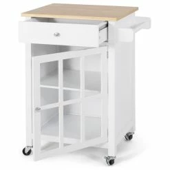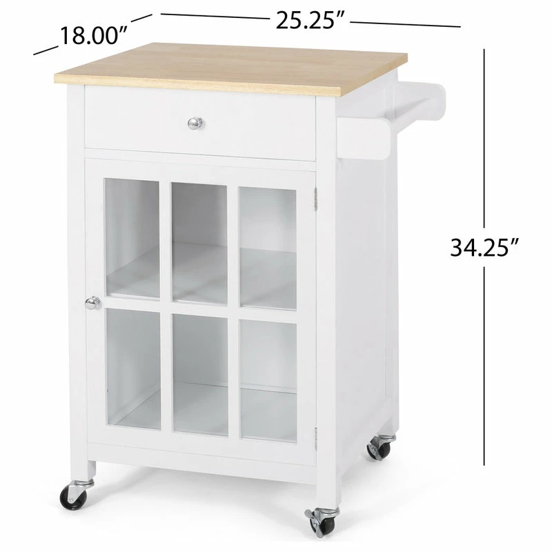 Coordinate your kitchen space with an outstanding accessory of practical charm. From its stunning glass-paneled cabinet to its incredible functionality, our kitchen cart offers ample organizational space to upgrade your living standard with a breeze. This piece offers a stunning contemporary style and convenient design that gives you plenty of options to effortlessly and efficiently store your kitchen accessories. Crafted with sturdy wood and rolling casters, our kitchen cart brings a fresh yet timeless look for you to utilize with ease.