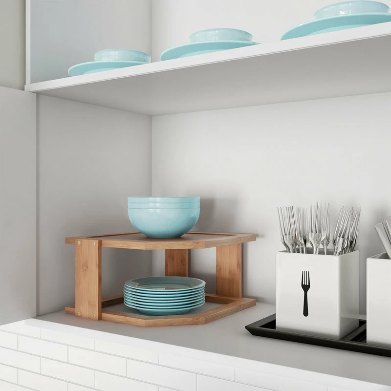 The 2-Tier Bamboo Corner Shelf by Lavish Home is a practical and convenient way to keep your cabinets, cupboards and countertops organized and tidy! Constructed from eco-friendly bamboo, this storage rack is durable and bacteria resistant. This space saving natural wooden shelf is just the right size to store and organize a desk in your home office, stack plates or bowls in your kitchen cupboards, on the bathroom counter or corner of the shower the possibilities are endless!
