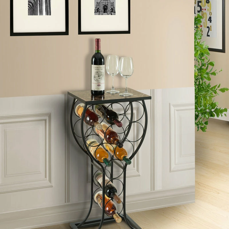 Metal wine storage organizer display rack table with marble top. This unique Pilaster Designs wine rack is sure to excite you. It is crafted with a metal and finished with a marble veneer top. Accent your home with the distinctive style of this wine rack. It allows for 11 bottles of wine.
