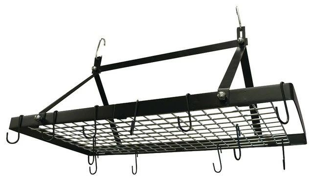 Rectangular shapped Pot Rack adds another option to your cookware needs. Assembled dimensions – 12 1/2 inches high by 32 inches wide by 18 inches deep. This Pot Rack will hold up to 40 pounds. Complete hardware for easy installation.