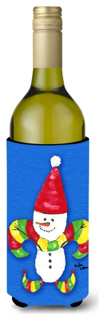 Christmas Snowman Fleur de lis Wine Bottle Hugger. Celebrate Christmas with this Christmas Wine Bottle Hugger. A great gift for the holiday or an addition to your Christmas decorations. Fits 750 ml. wine or other beverage bottles. Fits 24 oz cans or pint bottles. Great collapsable beverage insulator for large cans of beer, Energy Drinks or large Iced Tea beverages. Great to keep track of your beverage and add a bit of flair to a gathering. Wash the hugger in your washing machine. Design will not come off.
