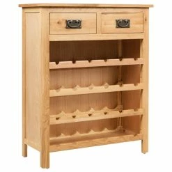 This wooden wine rack will be a timeless accessory for your home and perfect for wine collectors. Made of solid oak and MDF with oak veneer, this wine cabinet is sturdy and durable. It features flared cornices which add to its elegant style. The cabinet has ample storage space for keeping your wine bottles. The beautiful finish and the sleek metal parts ensure this product will enhance any interior. The wine cabinet is easy to assemble.