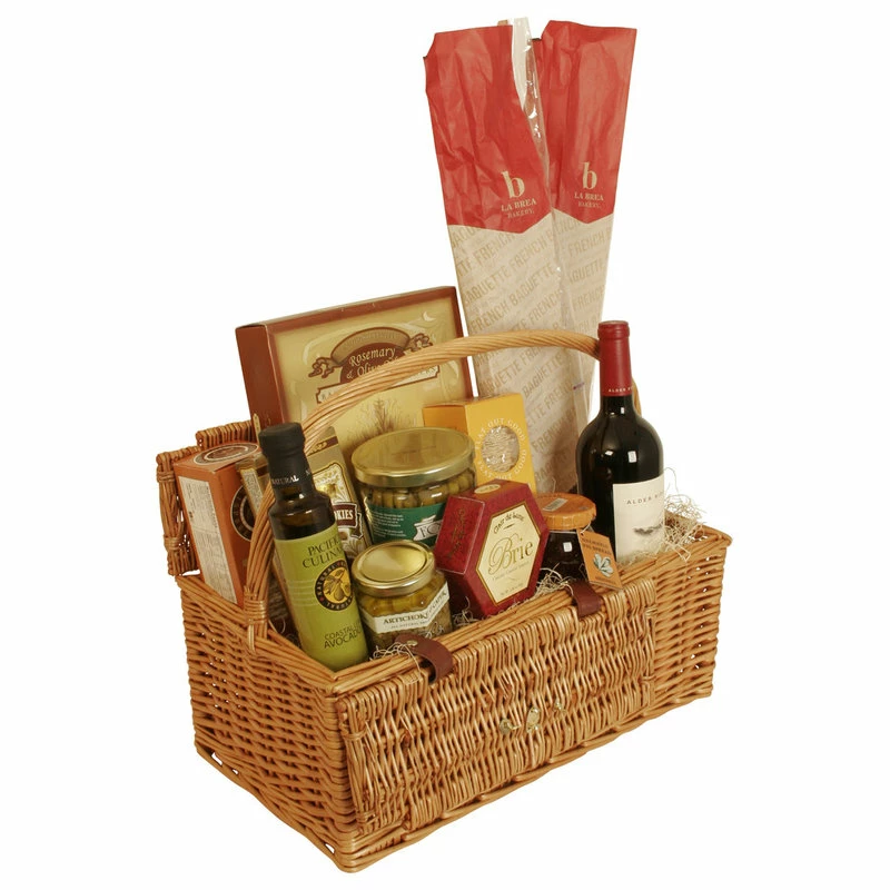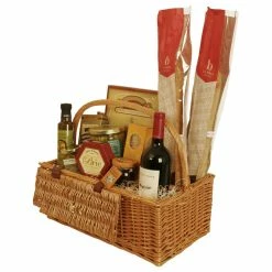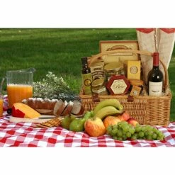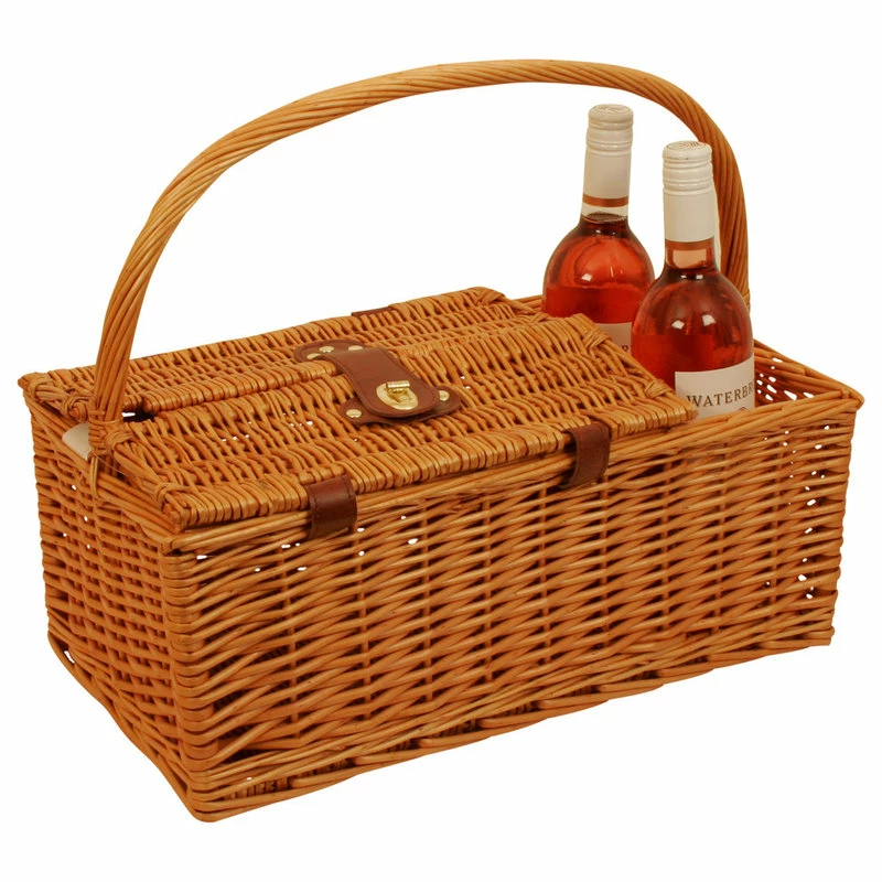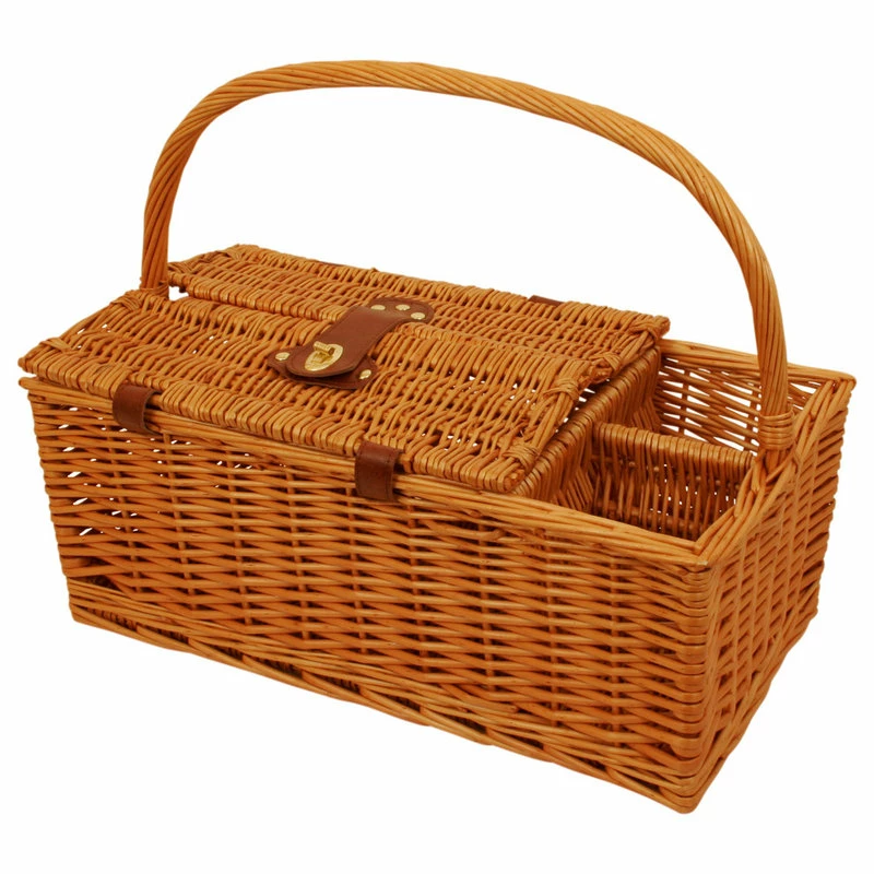 17-Inch Wicker Picnic Basket. This gorgeous picnic basket features a medium honey brown stain and 2 wine bottle compartments. Two sided hinged lid over main compartment has faux leather and brass clasp. Take our basket to the park for an afternoon picnic or use to create an attractive gift basket for family and friends. Also ideal use as storage and organization for household items like magazines, crafts or anything else that needs a home. Basket dimensions are 17-inches by 9.5-inches across inside top diameter, 7.5-inches deep and 14-inches tall with handle. Imported.